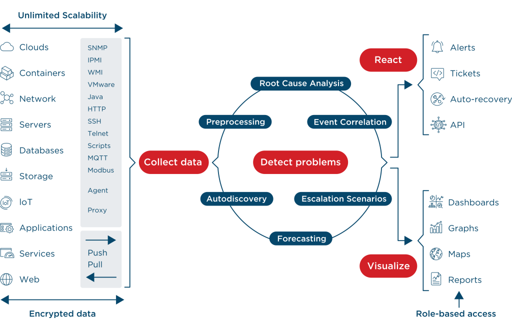 Monitorizar infraestruturas completas: servidores, redes, firewalls, aplicações, bases de dados, serviços cloud e muito mais